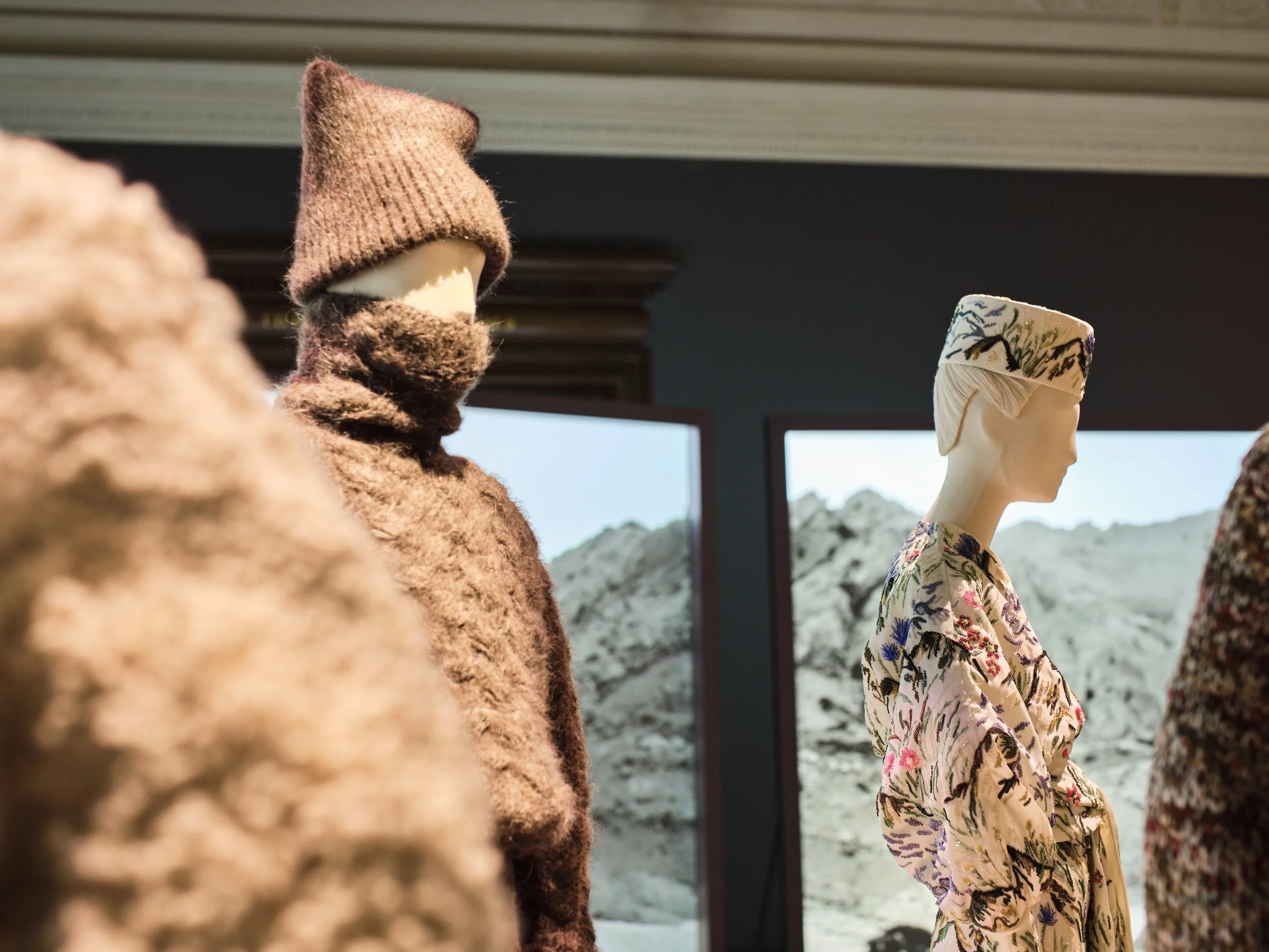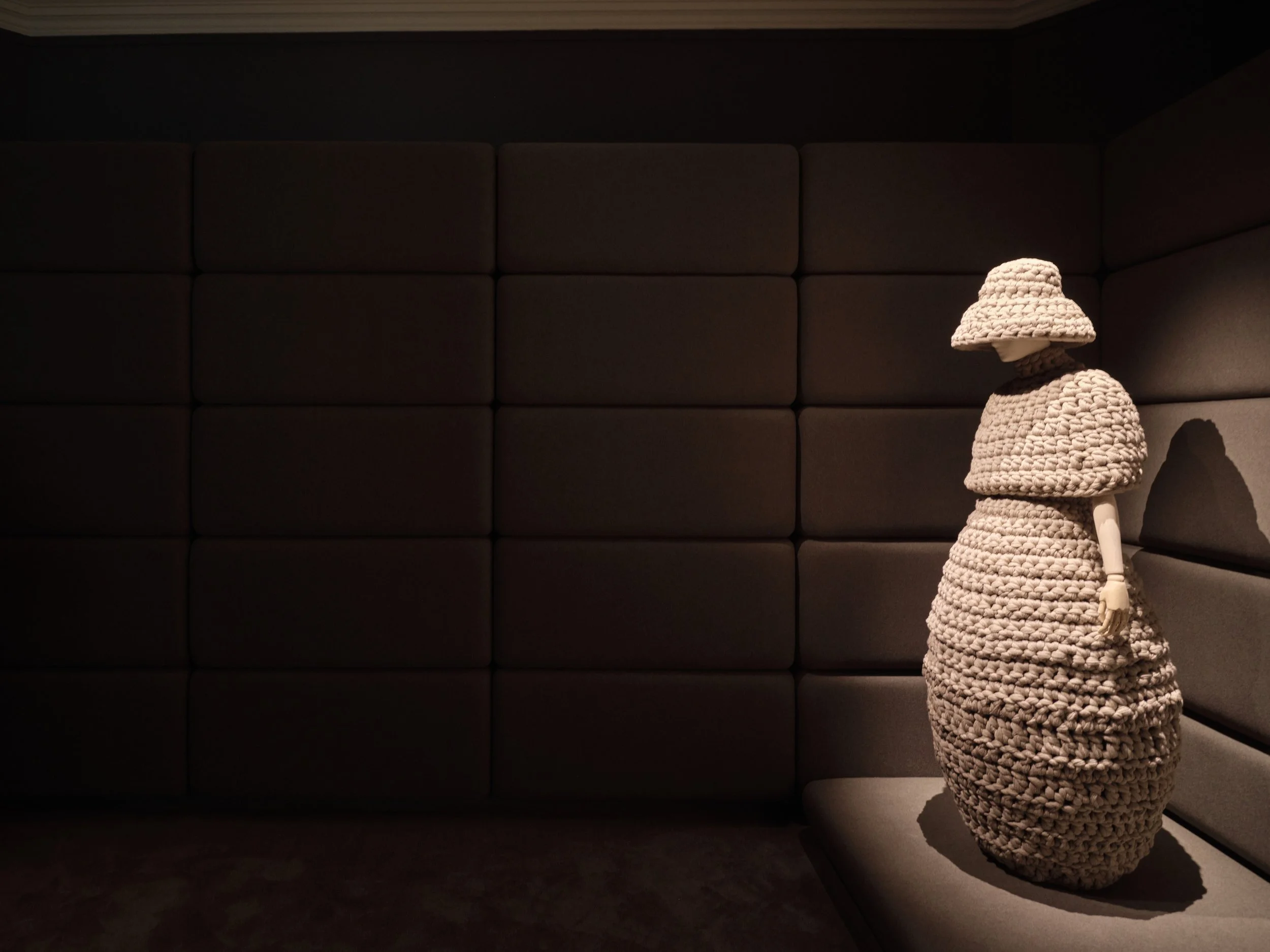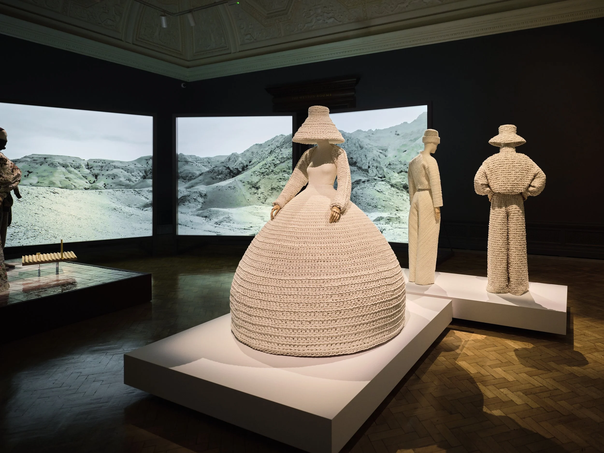 In the Small Weston Room, an immersive, sensorial space cocoons visitors in a cashmere-clad backdrop, spotlighting sculptural knitted and woven silhouettes.